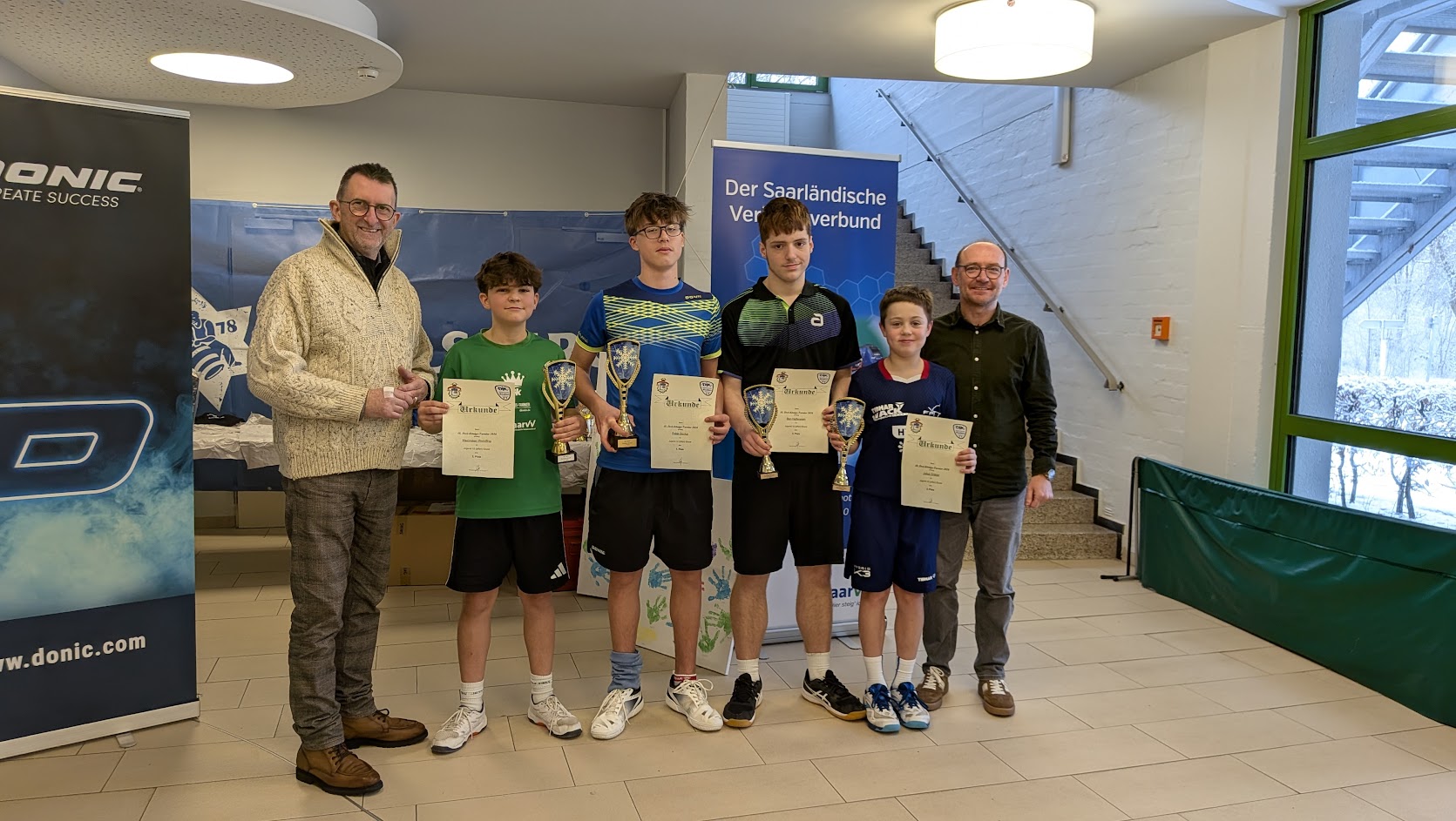 Robin Becker sichert sich den Titel zum dritten Mal hintereinanderDurch den Schneefall ließ sich auch am frühen Samstag morgen kaum jemand abhalten. Glücklicherweise war er bekannt und viele Straßen waren schon in aller Frühe geräumt. Ben aus Tiefenstein und einige Spieler aus dem Hochwald schafften es leider nicht, wofür wir natürlich das größte Verständnis hatten. Dadurch geriet die Setzung ein wenig ins Wanken, doch bei der Vielzahl an guten Spielern fiel es letztlich kaum ins Gewicht.In der KO-Runde gab es im oberen Tableau des 16er-Feldes nur klare Ergebnisse, wohingegen darunter in doch drei sehr umkämpften Spiele das Weiterkommen ermittelt wurde. Julius musste sein gesamtes Können aufbieten, um gegen Erine zu gewinnen, Max revanchierte sich in einem knappen Spiel gegen Elijah für die Niederlage bei den Top12 und Sam kam wie die anderen beiden auch erst im fünften Satz gegen Milian weiter. Im Viertelfinale zog Robin unbeirrt seine Kreise und war auch durch Simon nicht zu gefährden. Nils hatte in den ersten beiden Sätzen gegen Ben durchaus seine Chancen, Jonas unterlag in vier Sätzen Julius und Max kam in einem wieder einmal sehr engen Spiel gegen Sam in die nächste Runde. Im Halbfinale wehrte sich Ben nach Kräften, doch Robins Ausnahmestellung war auch durch ihn nicht zu gefährden. Julius hingegen machte es Max so richtig schwer, egalisierte seinen Rückstand nach den ersten beiden Sätzen und musste sich dann doch – wenn auch nur knapp – geschlagen geben. Im Finale gab Max alles, doch auch er musste anerkennen, dass Robin sich seinen dritten Titel bei der U15 in Folge schlicht verdient hatte. Platzierungen1. Robin Becker (JC Wadrill)2. Max Wendling (DJK Roden) 3. Ben Helfenstein (DJK TT Ottweiler) 3. Julius Gräber (1. FC Saarbrücken TT) Ergebnisseite des Jugend Einzel U15 beim 48.Drei-Königs-Turnier (Gruppenphase) Ergebnisseite des Jugend Einzel U15 beim 48.Drei-Königs-Turnier (KO-Phase) Finale des Jugend Einzel U15 im Youtube-Channel der DJK Roden Abt.TT 48. DKT Nachlese Jugend 11