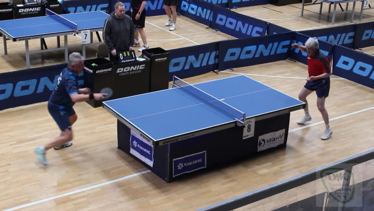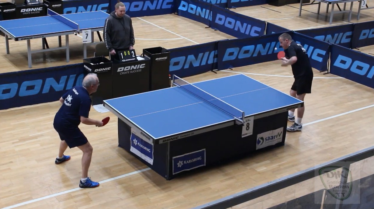 Jürgen Goldinger mit gutem HändchenDie Favoriten waren auch in den acht Gruppen vorne und so durfte man von einer spannenden KO-Runde ausgehen. Doch schon in Runde eins erwischte es den hoch gesetzten Ricardo Müller, der Sascha Schneider unterlag. Als in Runde zwei auch der bis dahin so souverän agierende Mark Berg an Dieter Schumacher scheiterte, war die Konkurrenz ihre zwei Topgesetzten los.Sascha und Jürgen nutzten die Gelegenheit und spielten sich über Dieter bzw. Stephan ins Finale. Dort entwickelte sich ein enges Match. Satzbälle hatten beide im ersten Durchlauf, Jürgen konnte einen davon zum 16:14 nutzen. Der zweite Satz ging klar an ihn, Sascha erkämpfte sich den dritten und schien bei 5:1-Führung im vierten die Wende einleiten zu können, doch Jürgen kam zurück und gewann diese knappe Entscheidung zu guter Letzt doch noch. Platzierungen1. Jürgen Goldinger (DJK Dudweiler)2. Sascha Pierron (TTC Hülzweiler) 3. Stephan Bier (TTC Köllerbach) 3. Dieter Schumacher (DJK Heusweiler) Ergebnisseite des Senioren Einzel Ü40 B beim 48.Drei-Königs-Turnier (Gruppenphase) Ergebnisseite des Senioren Einzel Ü40 B beim 48.Drei-Königs-Turnier (KO-Phase) Finale des Senioren-Einzel Ü40 B im Youtube-Channel der DJK Roden Abt.TT 48. DKT Nachlese Senioren Ü50