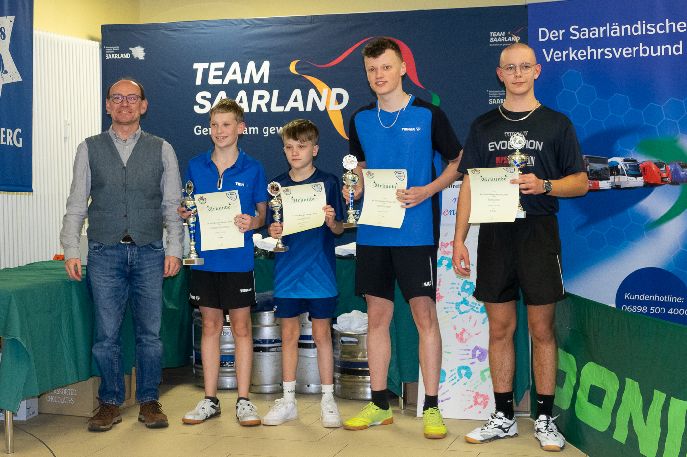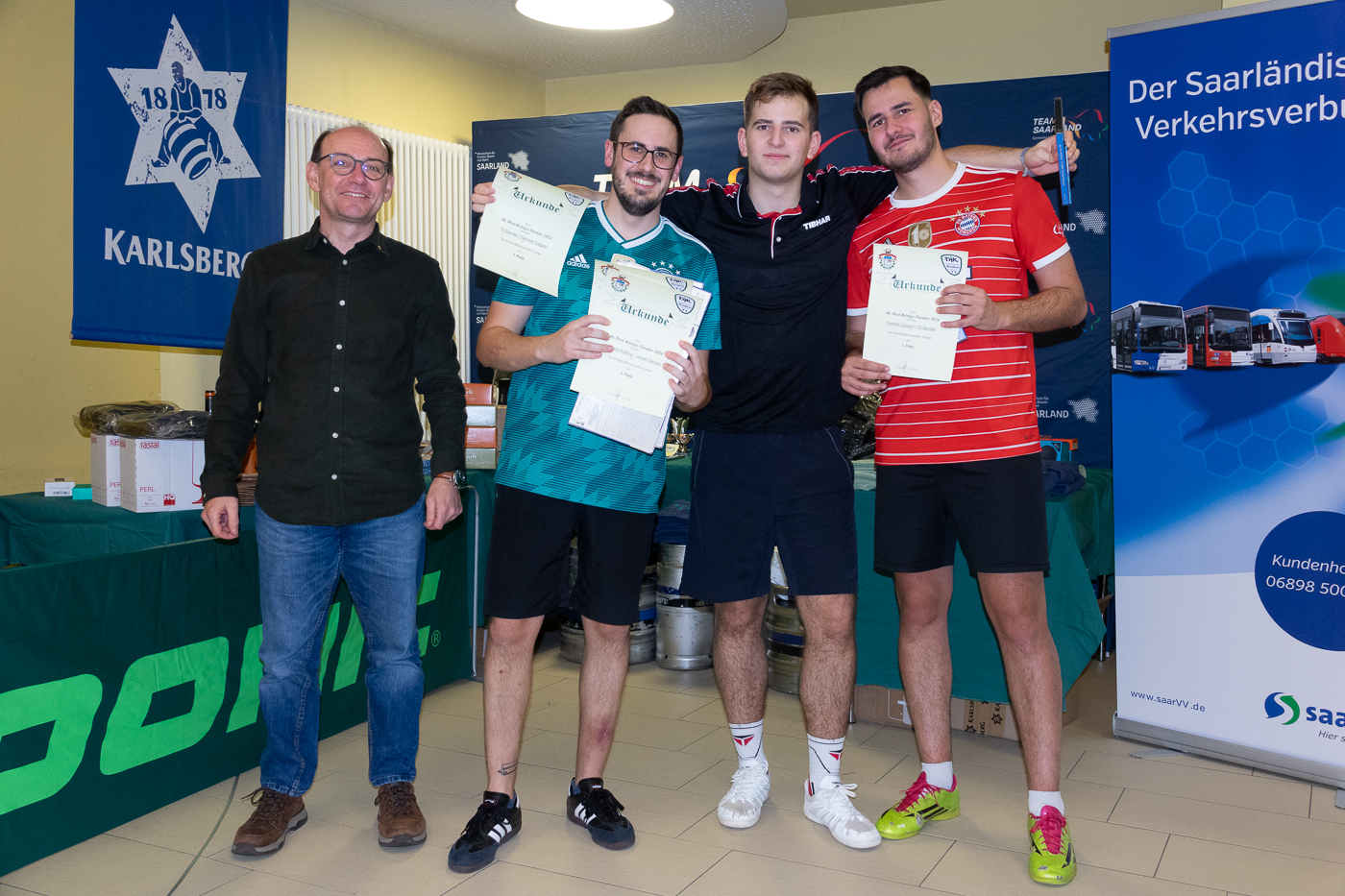 Unser Team-Wettbewerb ist eine schöne Zusammenführung der Hobby-Spieler mit jeweils einem Aktiven. Spielfreude kann sich verdoppeln, Stress halbieren. Waren wir im ersten Jahr der Durchführung noch etwas übervorsichtig und schrieben die Turnierzettel von Hand, so schreitet die Integration der Hobbyspieler mit der zweiten Auflage auch EDV-technisch weiter voran und wir konnten den gesamten Wettbewerb -wenngleich mit Mühen- in der Tunriersoftware MKTT abbilden. Das hilft im Turnierablauf, weil man dadurch einen zeitlichen Überblick über diese Konkurrenz behält, die ja viele Tische und Wettkampfzeit bindet, es hilft aber auch bei der Dokumentation im Nachhinein und so geht uns auch nicht verloren, was sich da in dier Saarlouiser Stadtgartenhalle am Freitag Abend parallel zu den Senioren abgespielt hat.Es gab ein reines Hobby-Team, der zweifache Einzelmeister der Hobby-Spieler war auch dabei, bei manchem Team war der Unterschied gar nicht so groß, bei anderen hingegen spielten Oberliga-Akteure die Hauptrolle. Geschwister spielten zusammen, Freunde, so wurde eine harmonische Veranstaltung daraus. Es war also bunt gemischt und so manch einer hatte seinen Spaß daran, sich auch einmal mit einem Klassespieler in Einzel und Doppel zu messen.