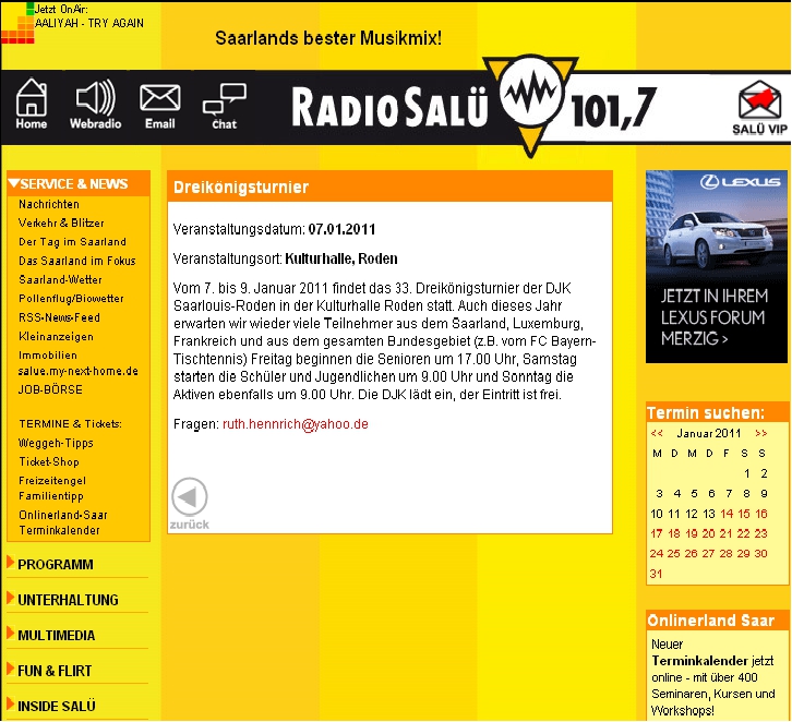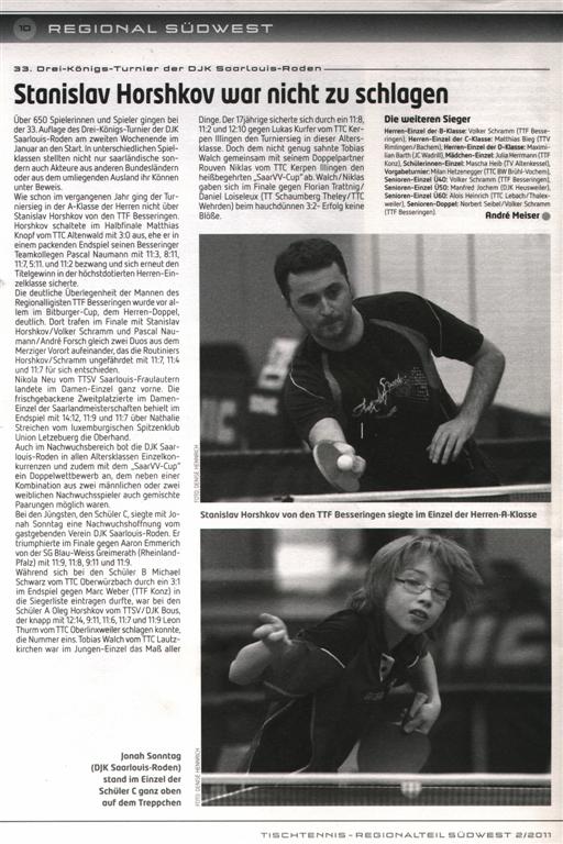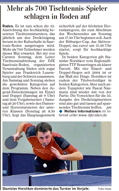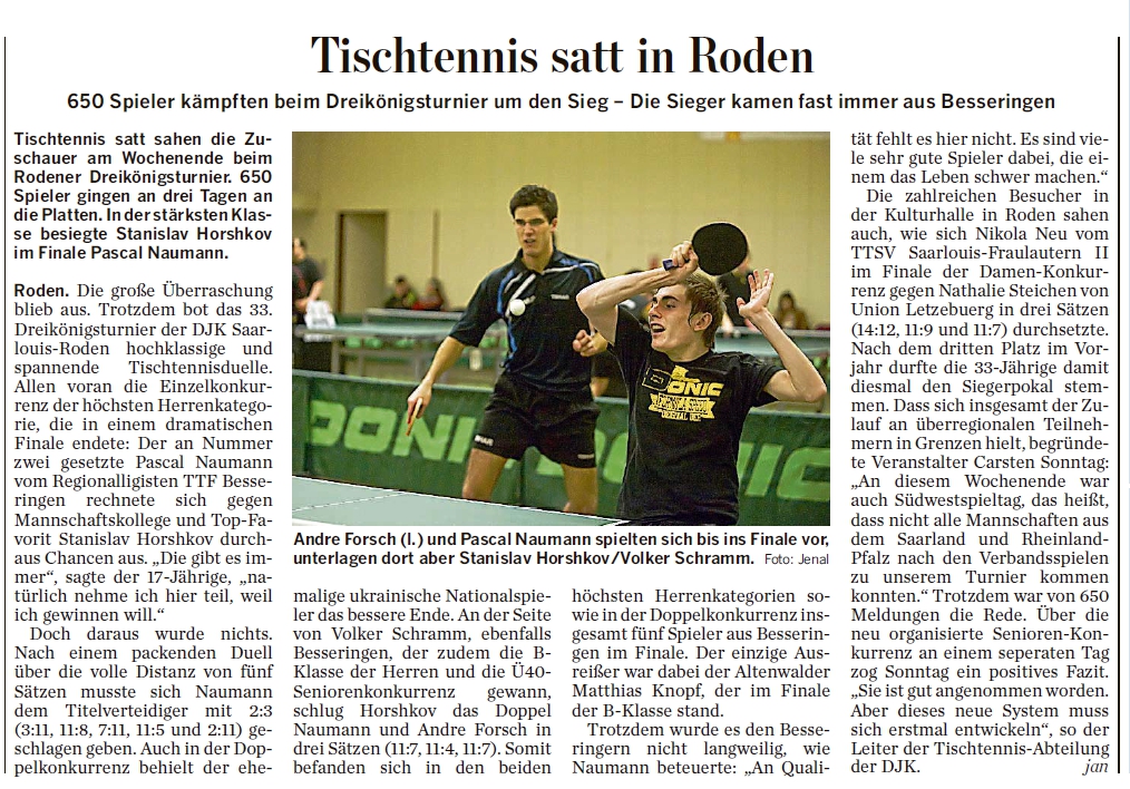Die Saarbrücker Zeitung schreibt am Mittwoch, 12.1.2011: Von SZ-Mitarbeiter Jan Morawski Tischtennis satt in Roden650 Spieler kämpften beim Dreikönigsturnier um den Sieg – Horshkov siegt doppeltTischtennis satt sahen die Zuschauer am Wochenende beim Rodener Dreikönigsturnier. 650 Spieler gingen an drei Tagen an die Platten. In der stärksten Klasse besiegte Stanislav Horshkov im Finale Pascal Naumann. Roden/Besseringen. Die große Überraschung blieb aus. Trotzdem bot das 33. Dreikönigsturnier der DJK Saarlouis-Roden hochklassige und spannende Tischtennisduelle. Allen voran die Einzelkonkurrenz der höchsten Herrenkategorie, die in einem dramatischen Finale endete: Der an Nummer zwei gesetzte Pascal Naumann vom Regionalligisten TTF Besseringen rechnete sich gegen Mannschaftskollege und Top-Favorit Stanislav Horshkov durchaus Chancen aus. „Die gibt es immer“, sagte der 17-Jährige, „natürlich nehme ich hier teil, weil ich gewinnen will.“ Doch daraus wurde nichts. Nach einem packenden Duell über die volle Distanz von fünf Sätzen musste sich Naumann dem Titelverteidiger mit 2:3 (3:11, 11:8, 7:11, 11:5 und 2:11) geschlagen geben. Auch in der Doppelkonkurrenz behielt der ehemalige ukrainische Nationalspieler das bessere Ende. An der Seite von Volker Schramm, ebenfalls Besseringen, der zudem die B-Klasse der Herren und die Ü40-Seniorenkonkurrenz gewann, schlug Horshkov das Doppel Naumann und Andre Forsch in drei Sätzen (11:7, 11:4, 11:7). Somit befanden sich in den beiden höchsten Herrenkategorien sowie in der Doppelkonkurrenz insgesamt fünf Spieler aus Besseringen im Finale. Der einzige Ausreißer war dabei der Altenwalder Matthias Knopf, der im Finale der B-Klasse stand. Trotzdem wurde es den Besseringern nicht langweilig, wie Naumann beteuerte: „An Qualität fehlt es hier nicht. Es sind viele sehr gute Spieler dabei, die einem das Leben schwer machen.“ Die zahlreichen Besucher in der Kulturhalle in Roden sahen auch, wie sich Nikola Neu vom TTSV Saarlouis-Fraulautern II im Finale der Damen-Konkurrenz gegen Nathalie Steichen von Union Letzebuerg in drei Sätzen (14:12, 11:9 und 11:7) durchsetzte. Nach dem dritten Platz im Vorjahr durfte die 33-Jährige damit diesmal den Siegerpokal stemmen. Dass sich insgesamt der Zulauf an überregionalen Teilnehmern in Grenzen hielt, begründete Veranstalter Carsten Sonntag: „An diesem Wochenende war auch Südwestspieltag, das heißt, dass nicht alle Mannschaften aus dem Saarland und Rheinland-Pfalz nach den Verbandsspielen zu unserem Turnier kommen konnten.“ Trotzdem war von 650 Meldungen die Rede. Über die neu organisierte Senioren-Konkurrenz an einem separaten Tag zog Sonntag ein positives Fazit. „Sie ist gut angenommen worden. Aber dieses neue System muss sich erstmal entwickeln“, so der Tischtennis-Abteilungsleiter. Am Rande In der Liga starten die Tischtennisfreunde Besseringen am Samstag, 22. Januar, in die Rückrunde. Und das mit einer sehr reizvollen Partie: Derzeit liegen die Saarländer auf dem achten Platz, der am Saisonende eine Relegation um den Klassenverbleib notwendig machen würde. Zu Gast in der Schulturnhalle ist zum Rückrunden-Auftakt der Tabellen-sechste Post SV Mühlhausen II, der nur einen Punkt mehr auf dem Konto hat. Die Frauen des TTV Rimlingen-Bachem mussten in einer vorgezogenen Partie am Sonntag eine 1:8-Niederlage beim Tabellenvierten TTC Mülheim-Urmitz einstecken. Katharina Palm sorgte dabei mit einem 3:2 gegen Sonja Lauf für den Ehrenpunkt. Die Saarländerinnen bleiben dadurch auf dem neunten Tabellen-Rang, einem Abstiegsplatz. Am 22. Januar empfängt Rimlingen den Tabellenführer SV Darmstadt 98, einen Tag später ist Abstiegskonkurrent TSG Heidesheim zu Gast. In dieser Partie muss unbedingt ein Sieg her. red ![]() Bildunterschrift Die Besseringer Andre Forsch (links) und Pascal Naumann spielten sich bis ins Finale vor, unterlagen dort aber ihren Vereinskollegen Stanislav Horshkov und Volker Schramm.Foto: Jenal Stanislav Horshkov Die Saarbrücker Zeitung schreibt am Samstag, 08.1.2011: Mehr als 700 Tischtennis-Spieler schlagen in Roden aufRoden. Es ist nun schon die 33. Ausrichtung des hochkarätig besetzten Tischtennisturniers, das jährlich um den Dreikönigstag herum in der Kulturhalle in Saarlouis-Roden ausgetragen wird. Mehr als 700 Teilnehmer werden dieses Mal erwartet. Bei der von Carsten Sonntag, dem Leiter Tischtennisabteilung der DJK Saarlouis-Roden, organisierten Veranstaltung finden sich sogar Spieler aus Frankreich Luxemburg und der Schweiz zusammen. Am Samstag und Sonntag stehen die gewohnten Kategorien auf dem Programm. Neben den Jugend-Entscheidungen im Einzel und Doppel (Samstag ab 9 Uhr) und dem Vorgabeturnier ( Samstag ab 20 Uhr), sowie den Damen- und Herrenturnieren der unteren Klassen (Sonntag ab 8.30 Uhr), liegt das Hauptaugenmerk sicherlich auf der höchsten Herrenkategorie, die zum Abschluss des Wochenendes am Sonntag um 17.30 Uhr beginnen soll. Auch der Bitburger-Cup, das Aktiven-Doppel, das zuvor um 15.30 Uhr startet, sorgt für hochkarätige Spiele.In beiden Kategorien gilt Stanislav Horshkov vom Regionalligisten TTF Besseringen als klarer Favorit. Mit vier Einzel- und Doppel-Siegen seit 2004 ist er das Maß der Dinge. Horshkov ist zudem der Titelverteidiger in beiden Kategorien. Aber auch andere Topspieler wie Pascal Naumann sind wieder mit von der Partie. Die Vorzeichen für die 33. Ausgabe des Dreikönigsturniers sind also gut und lassen auf spannendes Tischtennis hoffen. jan Weitere Informationen im Internet unter www. djkroden.de