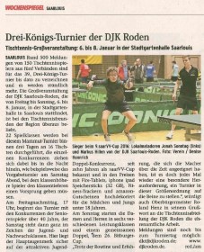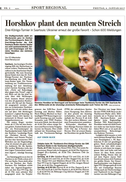 Horshkov plant den neunten StreichDrei-Königs-Turnier in Saarlouis: Ukrainer erneut der große Favorit – Schon 600 MeldungenDie Stadtgartenhalle steht am Wochenende ganz im Zeichen des Tischtennissports. Beim 39. Drei-Königs-Turnier der DJK Saarlouis-Roden starten Spieler aus acht Landesverbänden. Seinen acht Einzelsiegen will Stanislav Horshkov den nächsten hinzufügen. Saarlouis. Am heutigen Dreikönigstag fällt der Startschuss zu einem echten Tischtennis-Marathon in der Saarlouiser Stadtgartenhalle. Bis zum Sonntagabend findet dort das 39. Drei-Königs-Turnier der Tischtennis-Abteilung der DJK Saarlouis-Roden statt. Die Voranmeldung zur Traditionsveranstaltung lief laut Abteilungschef Carsten Sonntag erfreulich: „Nicht auf Rekordjagd, aber gegen den Trend“, sagt er mit Blick auf die bis jetzt bereits über 600 Meldungen. Nach letztem Stand können von den 23 geplanten Konkurrenzen alle bis auf die Damen 40 ausgespielt werden: „Mit den zu erwartenden Nachmeldungen bin ich mir sicher, dass wir auf über 700 Meldungen kommen“, ergänzt Sonntag. Im Vorjahr traten 264 Spieler in seinerzeit 16 Einzel- und fünf Doppelturnieren an. Die ersten Sieger werden heute ab 17 Uhr bei den Senioren gekürt. Zudem findet um 18 Uhr ein Erstrundenspiel im Saarlandpokal statt. Dabei trifft das Rodener Landesliga-Team um Christian Servet, Oleg Horshkov und Dennis Fischer auf den klar favorisierten TTC Wehrden aus der Regionalliga. „Das ist einmal ein ganz anderes Ambiente für die Spieler. Wir wollen Wehrden trotz der drei Ligen Unterschied zumindest ärgern“, kündigt Sonntag an. Am Samstag geht es an den 16 Tischen in der Halle schon ab 9 Uhr zur Sache. Dann steht alles ganz im Zeichen des Nachwuchses. Ein Jubiläum erlebt dabei das Jugend-Doppelturnier um den Saar-VV-Cup, das ab 15 Uhr zum zehnten Mal ausgespielt wird. Im Vorjahr gewann das DJK-Duo Jonah Sonntag und Markus Hillen. Nach Hillens Wechsel zu Saarlandligist TTF Besseringen versucht Sonntag nun mit Annika Brossette vom TTSV Fraulautern sein Glück. Am Abend sind ab 19.30 Uhr schon einige Damen und Herren beim Vorgabeturnier im Einsatz. Hier erhält anhand der Einstufung innerhalb des Tischtennis-Ratings (TTR) der schwächere Spieler einen Vorsprung. Den Aktiven ist aber primär der Sonntag vorbehalten, wenn nach dem Auftakt der Herren D ab 8.30 Uhr drei weitere Männer- und zwei Frauenturniere anstehen. Krönender Abschluss des Drei-Königs-Turniers bildet ab 17.30 Uhr das A-Turnier der Herren. Hier ist erneut Stanislav Horshkov der große Favorit. Der Ukrainer war lange Jahre für den TTSV/DJK Bous an der Tischtennis-Platte aktiv. Mittlerweile ist er Trainer bei der DJK Saarlouis-Roden und Spieler beim Regionalliga-Zweiten TSG Kaiserslautern. Horshkov weist mit 2229 Punkten nicht nur den besten Ranglisten-Wert auf, er ist auch der unumstrittene Rekordsieger des Rodener Turniers. Lediglich 2014 musste er sich nach hartem Kampf Marc Rode vom Zweitligisten 1. FC Saarbrücken II mit 2:3 geschlagen geben. Nach urlaubsbedingter Auszeit im Jahr 2015 revanchierte er sich dann im vergangenen Jahr und holte sich mit einem 3:1 über Rode seinen achten Erfolg. Dieses Jahr ist auf dem Papier Aaron Vallbracht mit seinen 2131 Punkten der größte Rivale. Der Einzel-Saarlandmeister von Regionalligist TTC Illingen geht ab 15.30 Uhr mit Clubkollege Rouven Niklas auch als Titelverteidiger und Topfavorit in das Doppelturnier um den Bitburger-Cup. Auf einen Blick Zeitplan beim 39. Tischtennis-Drei-Königs-Turnier der DJK Saarlouis-Roden in der Saarlouiser Stadtgartenhalle: Heute, ab 17 Uhr: Senioren-Einzel Ü50, Ü60, Ü65 sowie Seniorinnen-Einzel (alle in Gruppen), ab 18.30 Uhr: Senioren-Doppel (K.o.-System), ab 19.30 Uhr: Senioren Ü40 (in Gruppen). Samstag, ab 9 Uhr: Schüler-Einzel U11 und U15, ab 11.30 Uhr: Doppel U11 und U13, ab 12 Uhr: Doppel U15, ab 13.30 Uhr: Einzel U13 und Mädchen-Einzel U18, ab 15 Uhr: 10. Saar-VV-Cup im Jugend-Doppel, ab 16 Uhr: Jungen-Einzel U18, ab 19.30 Uhr: Vorgabeturnier. Sonntag, ab 8.30 Uhr: Herren B, ab 10 Uhr: Damen B, ab 11 Uhr: Herren B, ab 11.30 Uhr: Damen A, ab 13.30 Uhr: Herren C, ab 15.30 Uhr: 26. Bitburger-Cup Aktiven-Doppel, ab 17.30 Uhr: Herren A. bene (Bild: Ruppenthal) Die Saarbrücker Zeitung schreibt in der Saarlouiser Lokalausgabe vom 04.Januar 2017: Tischtennis: Mammut-Turnier am WochenendeRoden. Rund 500 Meldungen von 150 Tischtennisspielern haben die Organisatoren des 39. Drei-Königs-Turnier bis dato zu verzeichnen – und es werden stündlich mehr. Die Großveranstaltung der DJK Saarlouis-Roden, die von Freitag bis Sonntag in der Stadtgartenhalle stattfindet, ist bei den Tischtennisfreunden beliebt wie eh und je. 22 Spielklassen werden binnen drei Tagen an 16 Tischen durchgeführt. Die ersten Spiele finden am Freitag ab 17 Uhr mit den Konkurrenzen der Senioren über 40 Jahre statt, der Samstag steht ganz im Zeichen der Jugend. Hier liegt der Hauptaugenmerk auf der Doppel-Konkurrenz, dem zum zehnten Mal ausgetragenen Saar-VV-Cup. Am Sonntag starten dann die Damen und Herren in sechs verschiedenen Leistungsklassen und dem Doppel, dem Bitburger-Cup. redMeldungen sind noch bis zum Turniertag unter www.djkroden. de möglich. Der Wochenspiegel berichtet in der Ausgabe vom 03.Januar 2017: Drei-Königs-Turnier der DJK Roden - Tischtennis-Großveranstaltung: 6. bis 8. Januar in der Stadtgartenhalle Saarlouis SAARLOUIS. Rund 500 Meldungen von 150 Tischtennisspielern aus fünf Verbänden sind für das 39. Drei-Königs-Turnier bis dato zu verzeichnen und es werden stündlich mehr. Die Großveranstaltung der DJK Saarlouis-Roden, die von Freitag bis Sonntag, 6. bis 8. Januar, in der Stadtgartenhalle in Saarlouis stattfindet, ist bei den Tischtennisfreunden der Region überaus beliebt.