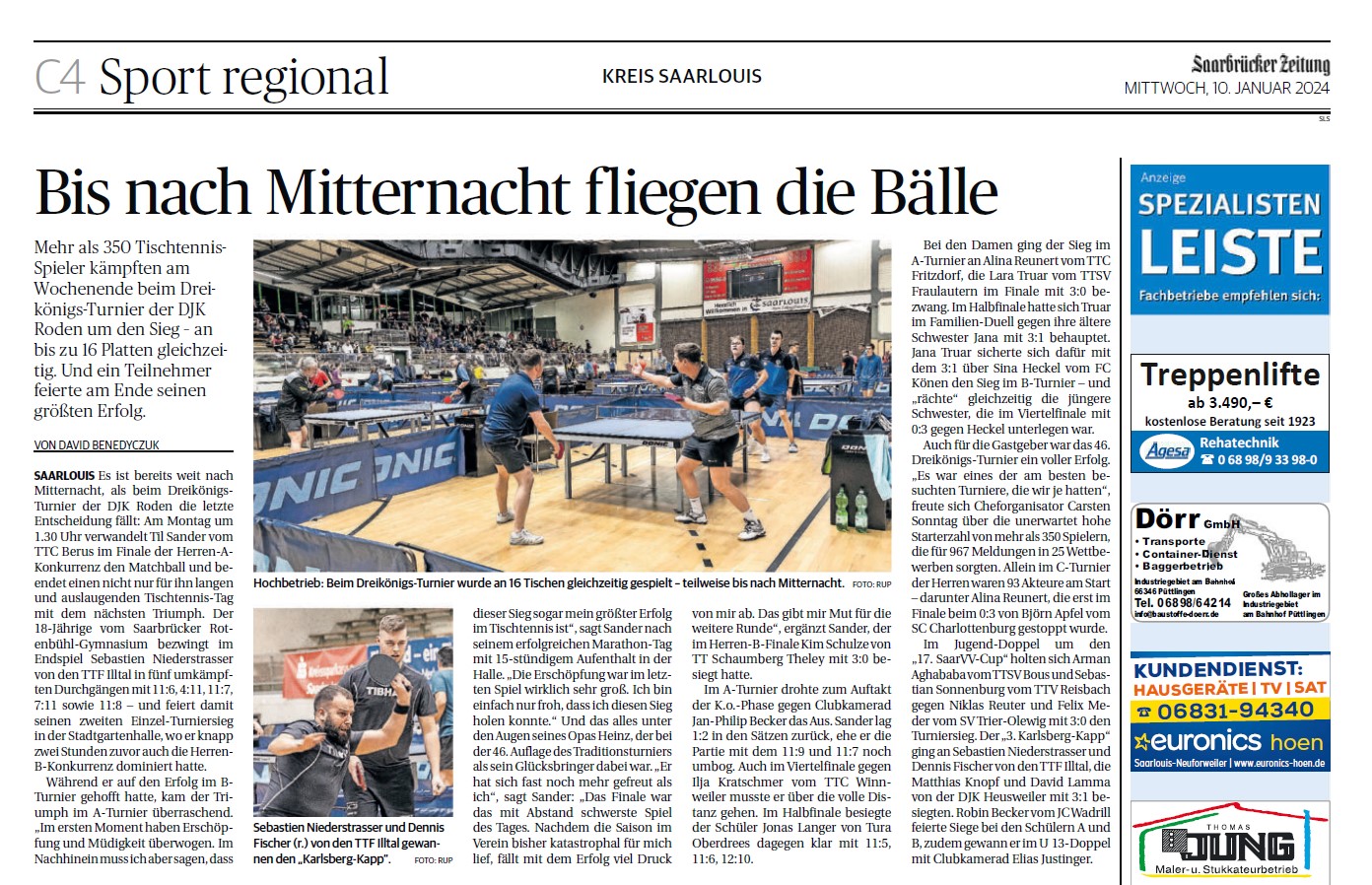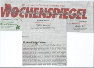 Presseberichte zum 46.Drei-Königs-TurnierLouie - das Amtliche Magazin der Kreisstadt Saarlouis im Wittich-Verlag berichtet vom 46.DKT![]() Die Rheinzeitung berichtet von Bernd Schulers Erfolgen beim Drei-Königs-Turnier ![]() Die Saarbrücker Zeitung berichtet im Saarlouiser Lokalteil am 10. Januar 2024 ![]() Die Saarbrücker Zeitung berichtet im Saarlouiser Lokalteil am 22. Dezember 2023 ![]() Der Wochenspiegel schreibt in der Ausgabe vom 30. Dezember 2023 ![]() Saarlouis. Die Tischtennisabteilung der DJK Saarlouis-Roden e.V. richtet vom 5. bis 7. Januar 2024 das traditionelle Drei-Königs-Turnier in seiner 46. Auflage aus. Spielort ist wie gewohnt die Stadtgartenhalle in Saarlouis. An allen drei Tagen fliegen in 26 Konkurrenzen die Bälle an 16 Spieltischen nahezu pausenlos und die DJK Roden lädt neben den sicher zahlreich meldenden Tischtennis-Cracks aus der Region alle Interessierte als Besucher gerne dazu ein, der Eintritt ist frei und für Verpflegung bestens gesorgt. Wenn sich die Turnierraster so füllen wie die vergangenen Jahre, dann werden über 250 Spieler rund 800 Meldungen abgeben und von Freitag Nachmittag bis zum späten Sonntag Abend wird fast ohne Stop gespielt. Auf der Homepage www.djkroden.de gibt es zum Turnier eine eigene Rubrik, die Ergebnisse werden während der Veranstaltung live getickert und alle Finals im Youtube-Channel des Vereins zeitnah eingestellt. Noch bis zum Turnierstart werden Meldungen zum Turnier angenommen, es gibt dazu auf der Vereins-Homepage die Möglichkeit der Onlinemeldung und einen Meldetracker, der alle eingehenden Starts anzeigt, Meldungen per Email an dkt@djkroden.de sind natürlich ebenso möglich und erwünscht. Zeitplan und einzelne WettbewerbeFreitag, 05. Januar 202417.00 Uhr Senioren Ü50, Senioren Ü60, Senioren Ü65, Senioren Ü70, Seniorinnen Einzel, Kombi-2er- 18.30 Uhr Senioren Doppelkonkurrenz 19.30 Uhr Senioren Ü40, Hobby-Einzel-Turnier Bei den parallel beginnenden Konkurrenzen Ü50, Ü60, Ü65 und Ü70 ist von jedem Starter nur eine Meldung möglich. Starts beim Doppel und der Ü40 und somit drei Konkurrenzen am Abend sind möglich. Samstag, 06. Januar 2024 09.00 Uhr Schülerinnen- und Schüler-Einzel C 09.00 Uhr Schüler-Einzel A 09.00 Uhr Schülerinnen-Einzel A 11.30 Uhr Schülerinnen- und Schüler-Doppel B und C (nur diese Altersklassen spielberechtigt) 12.00 Uhr Schülerinnen- und Schüler-Doppel A (nur diese Altersklassen spielberechtigt) 13.30 Uhr Schüler-Einzel B(Schülerinnen B sind auch spielberechtigt) 13.30 Uhr Mädchen-Einzel U19 15.00 Uhr 17. saarVV - Cup Jugend-Doppel (auch Mädchen-Doppel und Mixed möglich) 16.00 Uhr Jungen-Einzel U19 19.30 Uhr Vorgabeturnier Alle Einzel-Konkurrenzen werden in der Vorrunde in Gruppen ausgespielt. Die Hauptrunde findet im einfachen KO-System statt. Die Doppel-Konkurrenzen werden nach dem einfachen KO-System ausgetragen. Die Turnierleitung behält sich etwaige Änderungen des Spielsystems vor. Die Siegerehrungen finden im Anschluß an die einzelnen Konkurrenzen statt. Für alle Jugendkonkurrenzen gilt: Start nur in höchstens zwei Einzelkonkurrenzen möglich. Stichtage: Schüler C (U 11): Jahrgänge 2013 und jünger Schüler B (U 13): Jahrgänge 2011 und jünger Schüler A (U 15): Jahrgänge 2009 und jünger Jugend (U 19): Jahrgänge 2005 und jünger Damen/Herren: Jahrgänge 2004 und älter Senioren 40: Jahrgänge 1984 und älter Senioren 50: Jahrgänge 1974 und älter Senioren 60: Jahrgänge 1964 und älter Senioren 65: Jahrgänge 1959 und älter Senioren 70: Jahrgänge 1954 und älter Sonntag, 07. Januar 2024 08.30 Uhr Herren-Einzel D (bis QTTR-Wert 1550) 10.00 Uhr Damen-Einzel B (bis QTTR-Wert 1550) 11.00 Uhr Herren-Einzel B (bis QTTR-Wert 1950) 12.30 Uhr Damen-Einzel A (offen für alle) 13.30 Uhr Herren-Einzel C (bis QTTR-Wert 1750) 15.30 Uhr 3. Karlsberg-Kapp´ (Aktiven-Doppel); auch Damen-Doppel und Mixed möglich 17.30 Uhr Herren-Einzel A (offen für alle) Die Konkurrenzen Herren-Einzel D, C, B und A sowie Damen-Einzel werden in der Vorrunde in Gruppen ausgespielt. Die Hauptrunde findet im einfachen KO-System statt. Alle anderen Konkurrenzen werden nach dem einfachen KO-System ausgetragen. Die Turnierleitung behält sich etwaige Änderungen des Spielsystems vor. Die Siegerehrungen finden im Anschluß an die einzelnen Konkurrenzen statt. Für die Damenkonkurrenzen gilt: Start in zwei Klassen möglich, da beide Konkurrenzen nicht zeitgleich beginnen. Für alle Klassen in Bezug auf Meldung (Spielberechtigung für eine Klasse) und Setzung: Es gilt der QTTR-Wert von Dezember 2023 ! Unsere Leserreporter Carsten Sonntag aus Saarlouis |