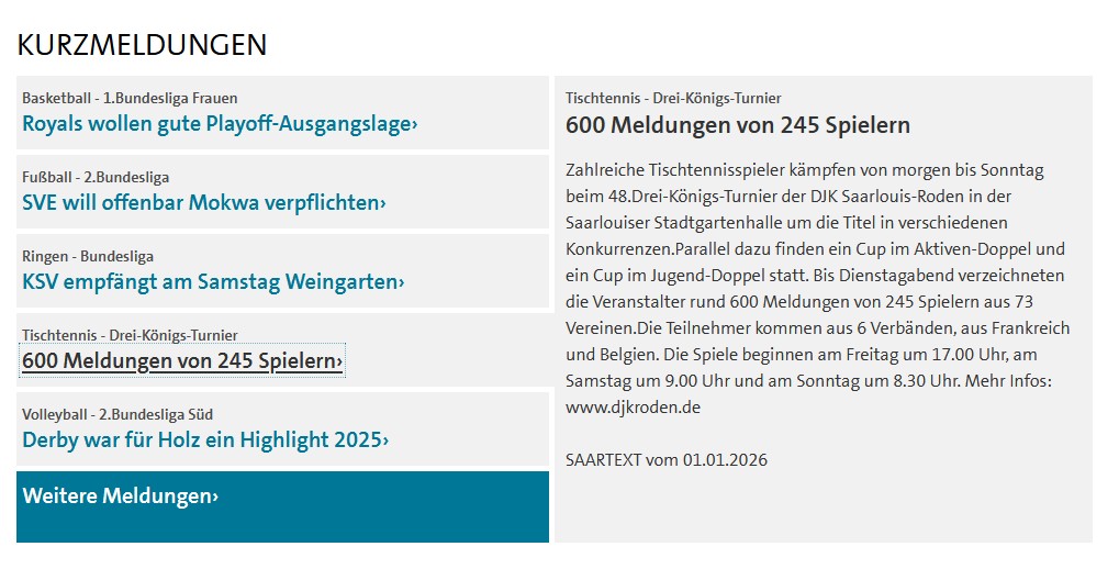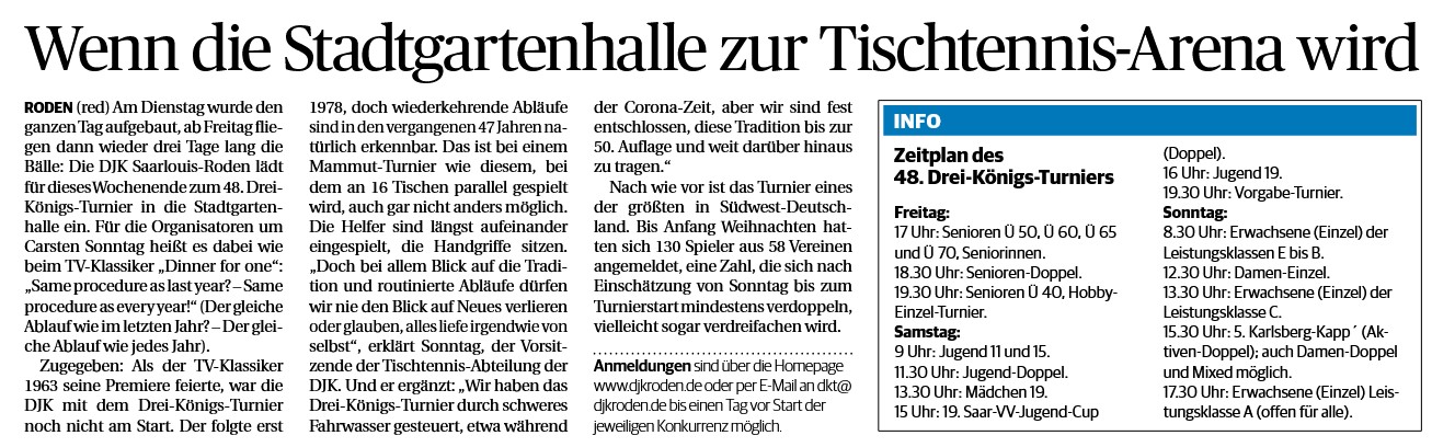 Presseberichte zum 48.Drei-Königs-TurnierDie Saarbrücker Zeitung schreibt in der Lokalausgabe vom 09. Januar 2025Tischtennis-Traditionsturnier Heftiger Schlagabtausch bis tief in die NachtSaarlouis · Es ist seit 1978 fester Bestandteil des saarländischen Tischtennis-Kalenders: Das Drei-Königs-Turnier der DJK Roden lockte wieder Hunderte Spieler in die Stadtgartenhalle. Ein Vater und seine Tochter durften besonders jubeln.Hochbetrieb: Drei Tage lang war beim Drei-Königs-Turnier in der Stadtgartenhalle an 16 Tischtennis-Platten richtig was los.Von David Benedyczuk332 Spieler aus 94 Vereinen und insgesamt 844 Meldungen für die verschiedenen Konkurrenzen im Einzel und Doppel: In der Saarlouiser Stadtgartenhalle waren die 16 vereinseigenen Tischtennis-Platten am Wochenende beim 48. Drei-Königs-Turnier der DJK Saarlouis-Roden an allen drei Tagen nahezu durchgängig besetzt. Ob jung oder alt, ob groß oder klein: Die vielen Teilnehmer sorgten am ersten Wochenende des neuen Jahres für eine Vielzahl spannender Spiele – und eine besondere Akustik in der großen Halle. Das Dauerklacken der Tischtennis-Bälle kennt der DJK-Vorsitzende und Turnier-Organisator Carsten Sonntag seit Jahren bestens. „Die Resonanz war auch in diesem Jahr wieder sehr gut und zog sich quer durch alle Klassen, die wir nahezu alle besetzen konnten“, sagte er – und blickte bereits erfreut auf die nächste Auflage der erstmals 1978 ausgespielten Veranstaltung. Aufgrund der vielen Spieler und Partien zog sich auch der Schlusstag gehörig in die Länge. Fast bis 2 Uhr in der Nacht schlugen sich die Konkurrenten im Herren-Einzel und -Doppel am Sonntag die Bälle um die Ohren. Die beiden verbliebenen von 57 Paarungen im Kampf um die Doppel-Krone beim 5. Karlsberg-Kapp waren als Allerletzte im Einsatz – und Jan-Philip Becker und Til Sander vom TTC Berus hatten schließlich auch den längsten Atem: Sie bezwangen Firat Karadeniz und Michael Schwarz vom TTC Oberwürzbach in vier hart umkämpften Sätzen mit 11:8, 11:6, 9:11 sowie 11:9 und holten damit den Sieg in der letzten von 26 Entscheidungen seit dem Startschuss am Freitagnachmittag. Zuvor hatte am späten Sonntagabend Michael Schwarz, der seit dieser Saison für Drittliga-Aufsteiger TV Limbach spielt und zu überzeugen weiß, das Endspiel der höchsten Erwachsenen-Kategorie für sich entschieden – durchaus überraschend, denn der 26-Jährige bezwang mit Mike Holle vom Zweitligisten 1. FC Köln den eigentlichen Favoriten glatt in drei Sätzen. Schwarz, der zwischenzeitlich acht Jahre lang für den DT Berburg in Luxemburgs in der 1. Liga an die Platte ging und sich dort 2024 mit der Vizemeisterschaft verabschiedet hatte, sicherte sich den ersten Durchgang mit 11:7. Im Anschluss bewies das Oberwürzbacher Eigengewächs, das dort vergangene Saison in der Landesliga angesichts einer 32:0-Bilanz wenig Herausforderungen fand, zwei Mal Nervenstärke in der Verlängerung. Er schnappte dem 21-jährigen Holle den zweiten Satz nach dramatischem Verlauf mit 15:13 vor der Nase weg. Im dritten Durchgang machte Schwarz mit dem 13:11 seinen zweiten Triumph beim Drei-Königs-Turnier nach 2023 perfekt. Rekordsieger bei den Herren bleibt Stanislav Horshkov, der das Turnier bereits acht Mal gewinnen konnte. Im Vorjahr hatte sich Sascha Treinen vom TV Altenkessel in die Siegerliste eingetragen. Dort tauchten diesmal auch zwei Akteure der Gastgeber auf: Bei den Erwachsenen D sicherte sich David Ney, der meist für die vierte Mannschaft der DJK Saarlouis-Roden aufschlägt, mit einem glatten Dreisatzsieg über Richard Ruffing vom TTC Berus den Turniererfolg. Zuvor hatte er sich im Halbfinale ein enges Duell mit Fabio Aronica geliefert, das der 37-Jährige gegen seinen knapp zehn Jahre jüngeren Mannschaftskollegen mit 5:11, 12:10, 10:12, 11:8 und 12:10 gewann. Neys Tochter Cheyenne, die auch für den TTSV Fraulautern aufschlägt, durfte sich über den Sieg bei den U 19-Mädchen freuen. Sie bezwang die Französin Erine Bayard (Siegerin der U 15-Mädchen) knapp in fünf Sätzen mit 12:10, 6:11, 6:11, 11:6, 11:6. Nach der erfolgreichen Auflage 2026 ist der Termin für das nächste Drei-Königs-Turnier bereits fix: die 49. Austragung erfolgt vom 8. bis 10. Januar 2027. Wochenspiegel-Online schreibt in der Ausgabe von Dezember 2025 48. Drei-Königs-Turnier25. Dezember 2025 Landkreis SaarlouisSaarlouis. Same procedure as last year – same procedure as every year (Der gleiche Ablauf wie im letzten Jahr – der gleiche Ablauf wie jedes Jahr) wird „Miss Sophie“ beim Dinner for one zugeschrieben, einem sehr beliebten Silvester-Fernsehstück von Laurie Wylie aus Anfang der Sechziger. Zugegeben, da war die DJK Roden mit dem Drei-Königs-Turnier noch nicht am Start, erst 1978 startete das erste Tischtennis-Turnier in der Rodener Kulturhalle, doch wiederkehrende Abläufe sind in den letzten 47 Jahren durchaus erkennbar. „Bei allem Blick auf die Tradition und routinierte Abläufe dürfen wir nie den Blick auf Neues verlieren oder glauben, alles liefe irgendwie von selbst“, erklärt der Vorsitzende der Tischtennisabteilung der DJK Roden, Carsten Sonntag und ergänzt: „Wir haben das Drei-Königs-Turnier durch schweres Fahrwasser gesteuert, sei es die Corona-Zeit oder die Einführung der Turnierlizenz, aber wir sind fest entschlossen, diese Tradition bis zur 50. Auflage und weit darüber hinaus zu tragen.“ Bis Anfang Weihnachten sind bereits 130 Spielerinnen und Spieler mit 315 Meldungen ( 50% Jugendliche / 50% Erwachsene) aus 4 Verbänden plus Frankreich und insgesamt bis dato 58 Vereine eingeschrieben, eine Zahl, die sich mindestens verdoppelt, in manchen Jahren gar verdreifacht hat bis zu Turnierbeginn In 27 unterschiedlichen Konkurrenzen quer durch alle Alters- und Leistungsklassen treffen sich vom 02. bis 04. Januar 2026 in der Stadtgartenhalle in Saarlouis Tischtennis-Interessierte aus dem Hobby- und Verbandsspielbetrieb, um Spaß zu haben und Siegerinnen und Sieger zu küren. Noch 
