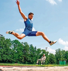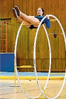 Große Sprünge im Stadion Großer Sand: Der Saarlouiser Gianluca Gattone gewann den Weitsprung der Altersklasse U18 mit 6,73 Metern klar vor Teamkollege Julian Horf (6,43 Meter). Fotos: RuppenthalDa liegt ein Sieg in der Luft: Der Saarlouiser Lars Pfiffer „fliegt“ in den Kreis der DJK Großenlüder/Hainzell. Die Gastgeber blieben in allen vier Spielen ungeschlagen.Das Rhönrad-Fahren gehörte zu den großen Attraktionen der Turnwettkämpfe.