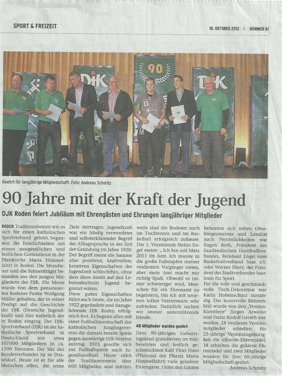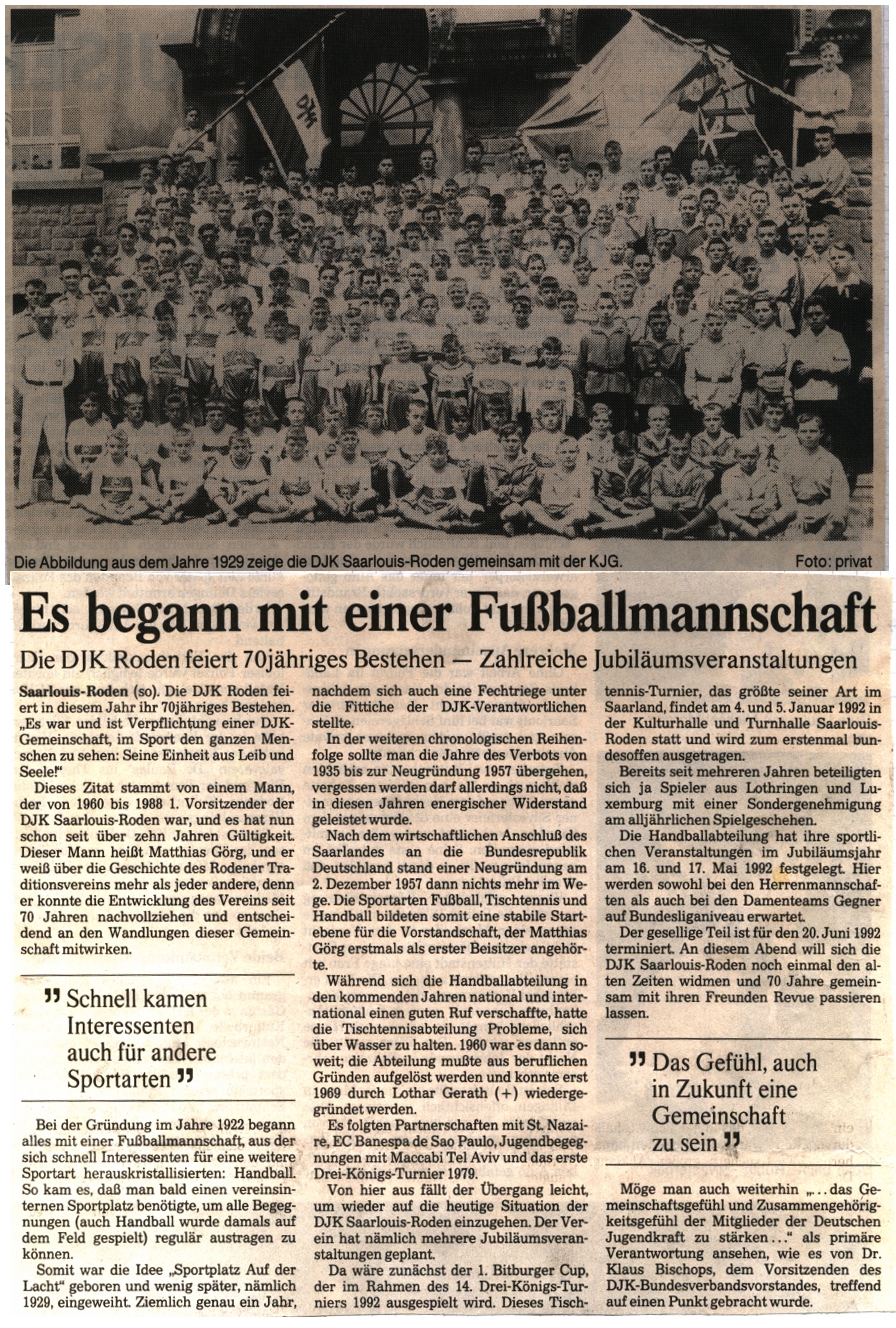 Pressebericht Saarbrücker Zeitung vom 2. Januar 1992 zum 70-jährigen Bestehen der DJK Saarlouis-Roden