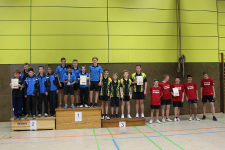 Sch?ler Auch hier wurde Wirges seiner Favoritenrolle gerecht, doch Weselberg und Geislautern lieferten ihnen sehr enge Matches und beide h?tten mit etwas Gl?ck ebenfalls das Ticket f?r die Deutsche buchen k?nnen. Insgesamt war der Erfolg jedoch verdient. Sch?n jedoch, dass auch Leiselheim als Viertplatzierter sich gut pr?sentieren konnte und mit erhobenen Haupt aus dem Turnier ging. Nico Eichten, leider verletzt, unterst?tzte sein Team vorbildlich und auch hier muss einmal lobend erw?hnt werden, dass mit keinem Wort diese deutliche Schw?chung eine Rolle spielte. |