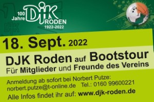 Am Sonntag, 18. September findet im Rahmen des 100-Jahr-Jubiläums eine DJK Bootstour statt, zu der alle Vereinsmitglieder und Freunde des Vereins eingeladen sind. Leider findet parallel auch das TOP12 Turnier der U13 und U19 im Tischtennis statt. Bitte also mit einer Meldung abwarten, ob wir uns da nicht mit ein paar Spielerinnen und Spielern qualifizieren. Alle, die aber am TOP 24 der Jugend nicht teilnehmen und alle Erwachsenen sind herzlich eingeladen, bei der Fahrt mitzumachen. Die Tour wird organisiert von den Handballern, weitere Infos auf der neugestalteten Homepage der Handballabteilung, hier die wichtigsten Eckdaten dazu.