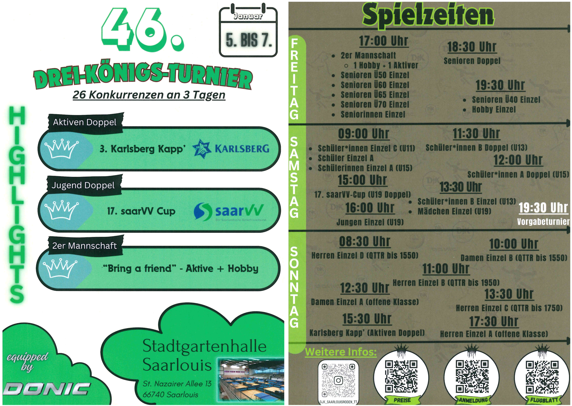 Gemeinsam mit unseren Partnern Donic, Sport-Schreiner-Tischtennis, saarVV und Karlsberg präsentieren wir hiermit die 46. Auflage des Drei-Königs-Turniers, den 17. saarVV-Cup sowie den 3. Karlsberg-Kapp´ vom 5. bis 7. Januar 2024 in der Stadtgartenhalle Saarlouis und heissen alle Gäste Herzlich Willkommen in der Kreisstadt Saarlouis.